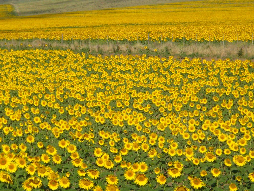 Die weg was een stuk smaller en eigenlijk nog saaier. Je ziet hier alleen maar rechte wegen grote velden langs de weg, afgewisseld met gras voor koe of paard en wat gewassen. De velden met zonnebloemen zijn wel heel mooi, verder is er veel graan en ligt er ook veel braak. Niet echt om over naar huis te schrijven. Als er nou heuveltjes of zo waren dat wordt het gelijk veel mooier en spannender. Wat zou er achter de volgende heuvel te zien zijn?…