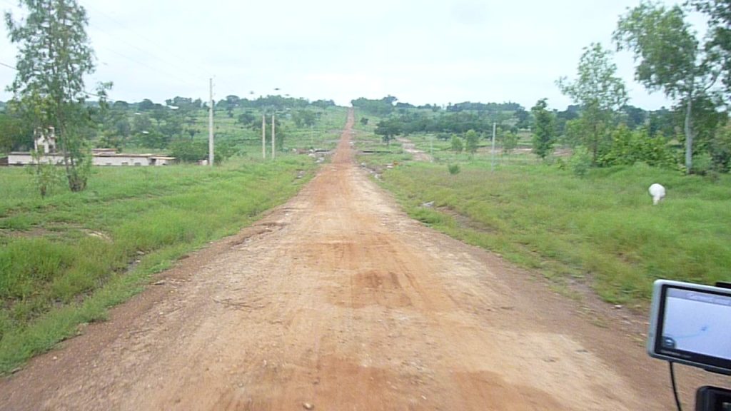 De weg tussen Djougou en Parakou staat op de kaart als zijnde snelweg, dus dat moest goed zijn. Maar hij begon met zo af en toe een daverend gat. Ach, dat was te laveren. 20 km verder werden de gaten groter en frequenter maar ook daar draaide ik geen hand voor om. Toen ik plots een ogenschijnlijk rustig zijweggetje zag besloot ik mijn auto daar voor de nacht te parkeren. Eenmaal stond ik of er kwam een hele stroom mensen langs, het bleek het toegangspad naar een dorp te zijn. Maar mensen waren niet lastig en tegen het donker hield de stroom met mensen op en had ik ik een rustige nacht.