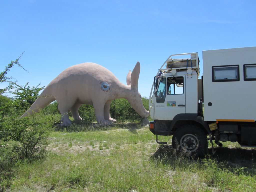 Alle drie wilde we graag de Kalahari in, maar ik weiger om 1500 Pula per dag neer te tellen om er met mijn auto in te rijden (50 Pula voor een gewone auto) dus ik had de volgende list verzonnen. De douane had, bij het invoer papier van mijn auto niet de werkelijke 8 ton genoteerd maar had het ledig gewicht van mijn auto opgeschreven, 4800 kilo. Omdat dat gewicht dus op een officieel douane document stond, wilde ik daarmee proberen de prijs wat te drukken. An en Jo gingen met deze papieren naar het kantoor van de parkdienst waar je de vergunningen moet halen om het park in te mogen rijden. Die keken echter niet naar de papieren en schreven gewoon een vergunning uit voor 2 auto’s a 50 Pula per dag. Ik dacht bij mezelf, als ik daar mee er in kom, ben ik spekkoper. Maar mijn gezond verstand zei dat als ik bij de ingang van het park zou staan, dat niet zou gaan lukken.