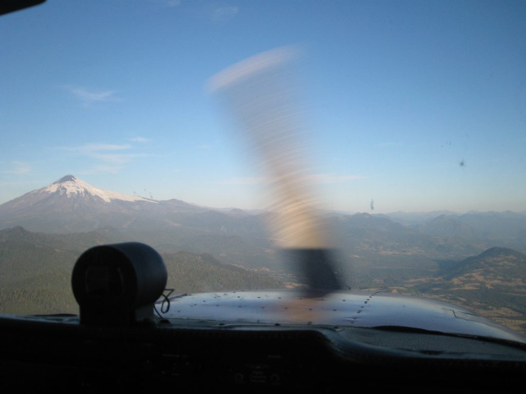 Een uurtje rond de vulkaan vliegen kost 100.000 peso (120 euro) per vliegtuig, en als je dat met z’n drieën kan delen (zoveel kan je in een Cesna proppen) is dat goed te doen. Maar om dat alleen op te hoesten vond ik wat veel. Echter was er een kans dat Max&Heidi hier zouden komen. Dat waren de Zwitsers met die hele grote MAN bak die ik ook al en Ushuaia (en heel even in Mont) was tegen gekomen. Dat zou mooi zijn, dan konden we met z’n drieën omhoog. Maar, verklaarde heer Pfeifer, dan moesten ze wel voor 6 uur komen anders werd het te donker. Om half 6 waren ze er nog niet en begon ik maar met het avondeten. Zag dat niet meer goed komen. Net toen ik het stuk vlees (Argentijns formaat) in de pan had gegooid kwamen ze toch nog aanrijden. Het was kwart over 6, maar het kon nog wel zei Pfeifertje. Hoppa in de Cesna en op naar de vulkaan.