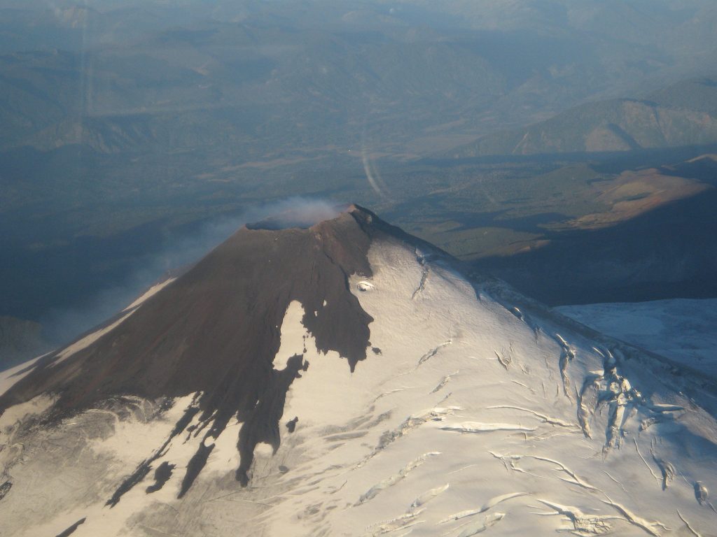 De Villarica vulkaan is 2850 meter hoog, van boven bedekt met eeuwige sneeuw en actief. Niet bijster actief, het is een beetje een luie vulkaan, maar toch. Elke paar jaar spuugt ie zo een paar weken lava. Echte uitbarstingen van formaat ‘erg’ zijn er lang niet geweest. Van boven kon je in de krater kijken. Die krater was niet zo diep want hij was blijkbaar helemaal vol gelava’d. Wel kwam er best veel rook uit de krater. Op 3000 meter vlogen wij zo wat cirkeltjes over die krater heen. De piloot ging mooi schuin hangen zodat we het goed konden zien, het was erg enerverend.
