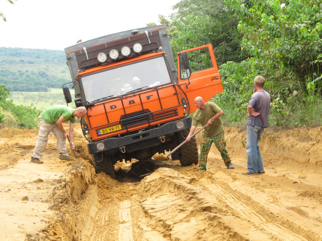 Die nacht regende het vroeg in de nacht zodat het in de ochtend redelijk was opgedroogd. Maar het pad had van al dat water van de afgelopen dagen en het weinige verkeer (verkeer rijd het zand weer plat en hard) veel te lijden gehad. Stukken weggeslagen weg van een paar honderd meter noopte soms tot halsbrekende avonturen. Er was een stuk, berg opwaarts, daar was de weg zo ver weggeregend dat we zelf met schoppen iets moesten fabrieken. In de vochtige warmte, omringd door stekende kleine irritante vliegjes schepte we zand in de kuilen en schepte het weg bij hoge stukken. John reed voor, die moest dus als eerste er door en zijn auto dreigde om te kiepen, zo schuin stond ie op een gegeven moment.