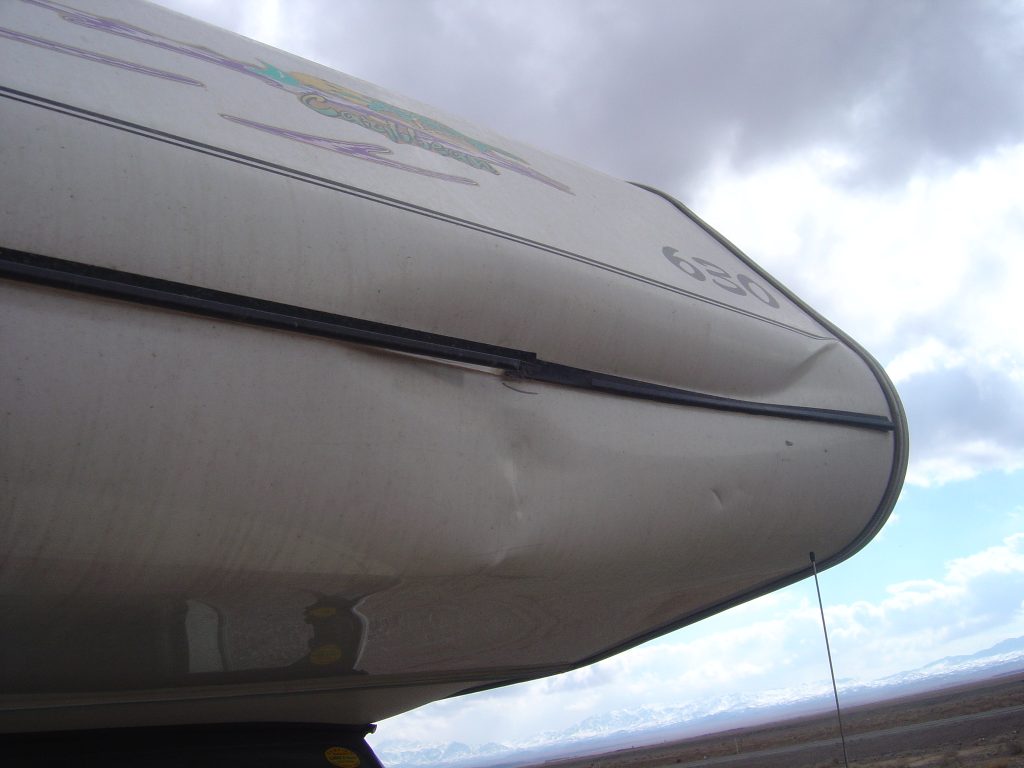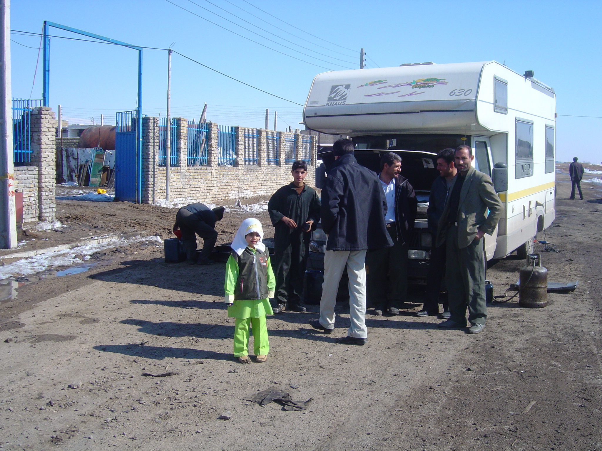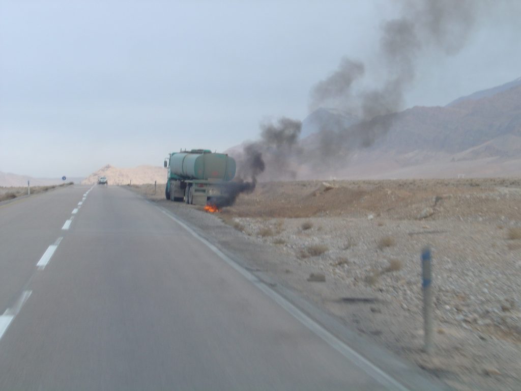 Na de nodige zoektochten naar diesel vond ik eindelijk een tankstation ongeveer 50 km van Yazd vandaan die diesel had en waar de rij met auto’s te overzien was. Ik kroop een beetje voor en ging achter een vrachtwagen staan, en stapte uit om te kijken welke pomp diesel had. Terwijl ik zo naar voren aan het lopen was zag ik ineens de vrachtwagen die voor me stond langzaam achteruit gaan. Ik schreeuwde naar de chauffeur, die had niks in de gaten, zat half te slapen, en prompt reed hij met zijn achterwielen een soort hobbel af waardoor zijn achterwaartse gang versnelde en BANG, tegen mijn auto aan. Ik schrok me het apezuur, want ik vermoede dat hij met zijn lading, die uitstak, mijn vooruit ramde. Als die gebroken was, dan had ik een dik dik probleem. Ik holde terug, schreeuwde nogmaals tegen die domme chauffeur en bij mijn auto aangekomen constateerde ik dat hij niet tegen mijn raam aan zat maar tegen mijn alkoof (het bovenste slaapgedeelte). Daar zat een dikke deuk in, en ook een klein deukje op de motorkap. Je snapt dat ik hier niet blij mee was, er ging zomaar een paar duizend euro van de waarde van mijn camper af, en ik nam maar gelijk aan dat die chauffeur dat niet kon betalen.