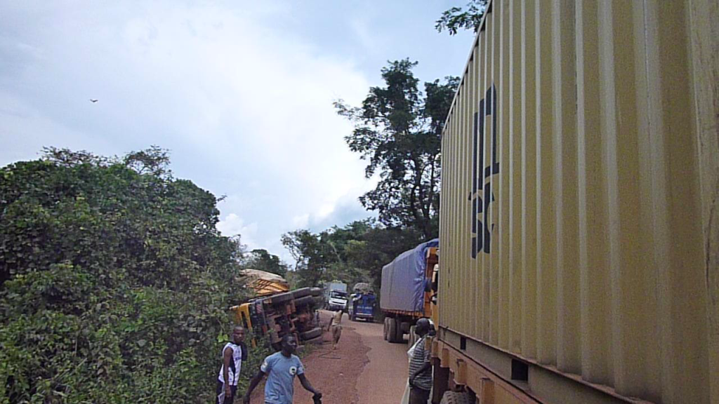 Het was droog de volgende dag en de piste werd beter omdat men er aan het werk is. Na een uurtje karren weer een dorp met een slagboom en een groot bord “verboden te rijden tussen 6:00 en 18:00 uur. Maar ik had me lesje geleerd en begon gelijk op de slagboom man in te praten. Die durfde de beslissing niet te maken en zegt letterlijk ‘ You have to ask the white, he will be here shortly”. Het is geen Boss, chief of Manager, het is ‘The White’. Die kwam 10 minuten later, bleek een schappelijke Portugees te zijn en we waren snel op weg, een rij wachtende vrachtwagens achter ons latend. De weg wisselde tussen pracht nieuw asfalt en schrikbarende piste. Het ergst was het net voor Garoua-Boulai. Daar loopt de weg vlak langs de Centraal Afrikaanse Republiek op en de Kameroense overheid had waarschijnlijk geen zin daar de weg te verbeteren. Het schijnt dat ‘s nacht veel criminelen uit deze Afrikaanse Republiek de grens over komen, moorden, stelen en zo voort om dan in de nacht weer schielijk terug naar hun eigen land te vluchten waar ze dus nooit opgepakt worden. Op één kilometer weg heb ik 5 omgevallen vrachtwagens gezien, 3 plekken waar alleen de lading lag en de vrachtwagen afgesleept was en één heel groot gat in de weg waar ik echt de hele auto in kwijt kon (en daar moest ik door). Mijn eerste echte moddergat overleefde ik met vlag en wimpel maar de weg tot Garoua-Boulai nam een hele poos in beslag.