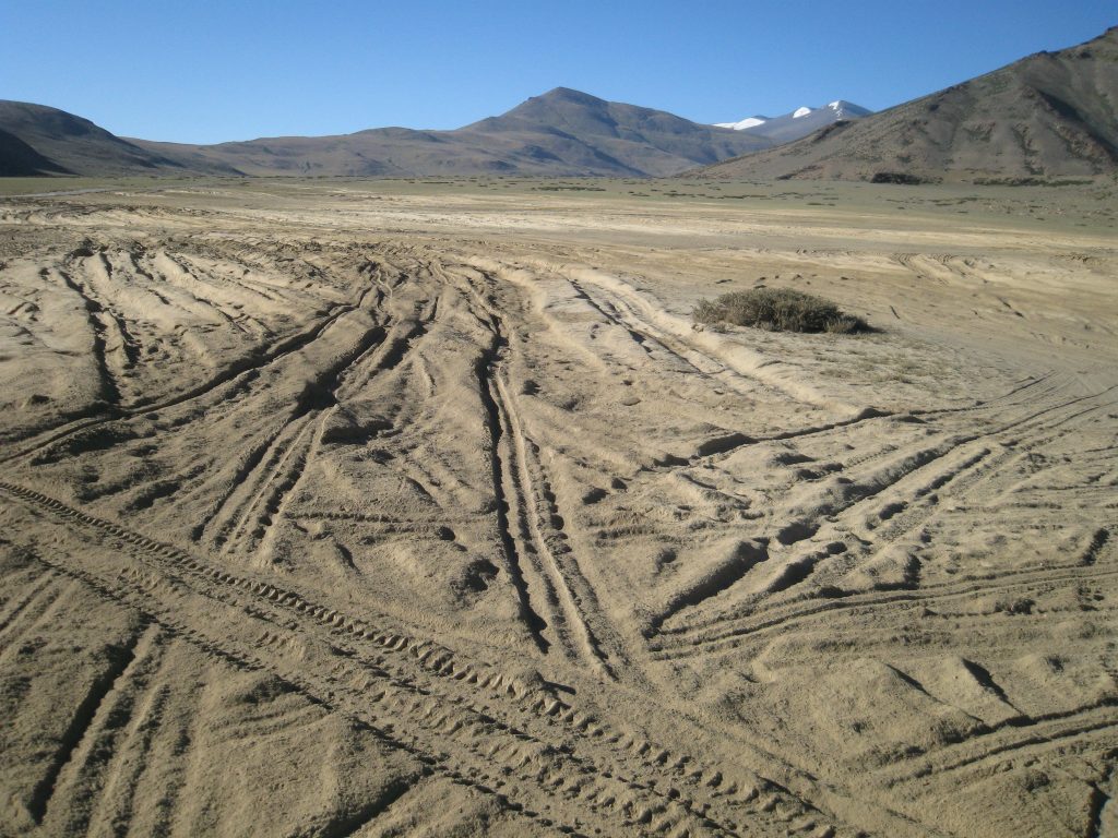 Had überhaupt op deze weg, de hele dag, denk ik 3 of 4 tegenliggers gehad! Dus je snapt, ik reed wat gespannen. Ver boven me zag ik de weg die afgesloten was, met daarop om de honderd meter een berg zand, dus daar kon ik inderdaad niet op. Maar mijn weg, die geen weg was, werd steeds spannender. Na 15 minuten zag ik plots een breed pad van onder af komen en met een diepe zucht van verlichting ging ik daar op rijden. Had geen enkel idee of ik wel goed reed. Toen ik plots een tent met wat nomaden zag zitten stopte ik om de weg te vragen. Manali? Vroeg ik. Jaja, gewoon door rijden gebaarde ze. Jaja, het pad werd steeds slechter en af en toe zaten er diepe stukken zand tussen. Zag dat sommige hadden geprobeerd het te omzeilen links of rechts en vast waren komen te zitten, de sporen waren stille getuigen van een hoop ellende denk ik. Mijn manier was om voor zo’n zand plek maar gewoon vaart te maken en er doorheen te raggen, als het heel erg leek zette ik de 4wheel drive aan. Dat verhinderde niet dat ik 3 tot 4 keer bijna vast kwam te zitten en met geluk steeds net de andere kant van de zandbak haalde.