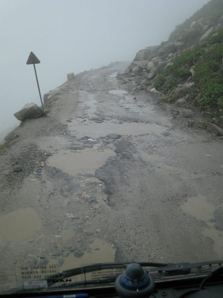 De muur met stenen lag pal naast het hobbelpad, zodat je niet eens uit kon wijken als er een gat of hobbel in het pad zat, die moest je maar nemen als een MAN. Na een slordige 15 kilometer begon er een langzame klim naar de 5000 meter, De weg werd nog erger en plots was de weg afgezet, men was bezig die kiezels te leggen.