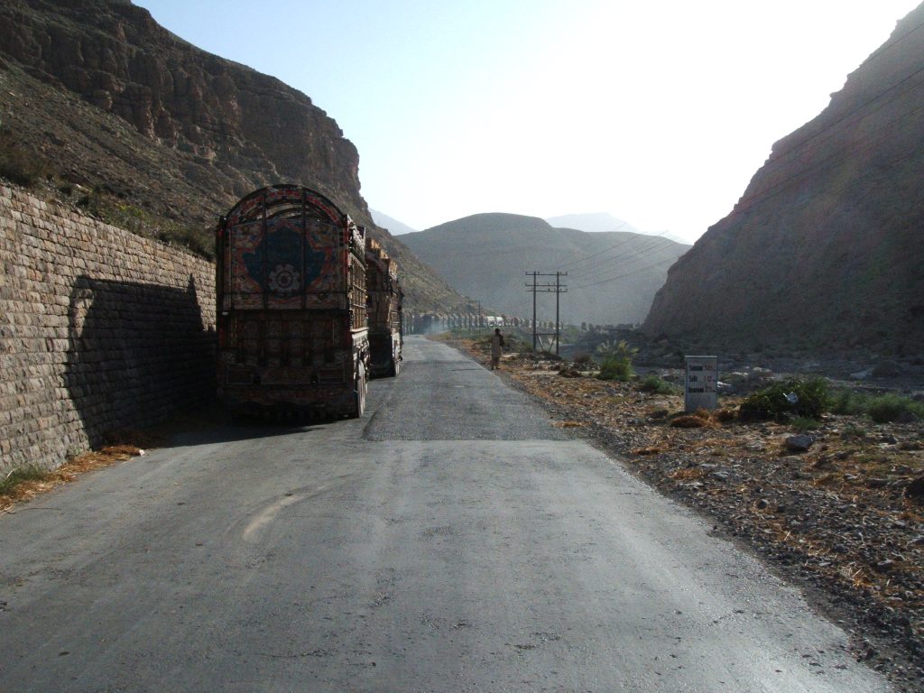 Na een uurtje reden we de Bolan pass in, en daar gebeurde wat je niet wilt vrezen, we reden achterop een mega file. Stilstaande vrachtwagens zo ver het oogt reikt (en dat was tot de volgende bocht 1 km verder). Wat te doen? Wachten? er toch voorbij met het risico dat je de boel verderop blokkeert?