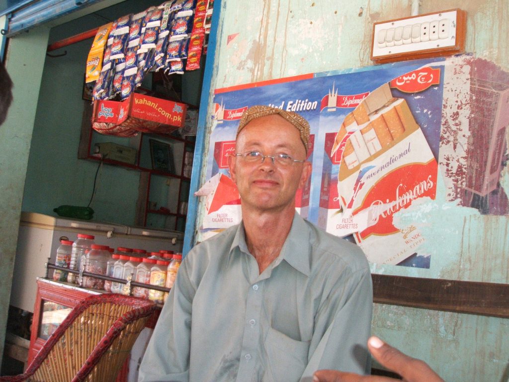 En dan voel je elke hobbel dubbel. Komt mijn loshangende schokbreker nog bij dan snap je dat het niet hard ging. Over de 330 km stuk hebben we, met de nodige tussenstops voor eten en plassen (we waren nu met 4 auto’s en ik was gebombardeerd tot konvooi leider) tot laat in de middag gedaan. 30 km voor Quetta nog een steile pas, waar de zwaar beladen vrachtwagens met tractoren de berg op worden gehesen, een raar gezicht. Ook kregen we hier een politie escort, die ons, in wisselende samenstelling naar het centrum van Quetta bracht waar, op mijn aanwijzen, we richting Bloomstar Hotel reden. De laatste politie escort had zelfs een gas geweer bij zich, en die gast stond met zijn geweer achter in de laadbak van de pickup truck, met dat ding steeds op mij gericht.