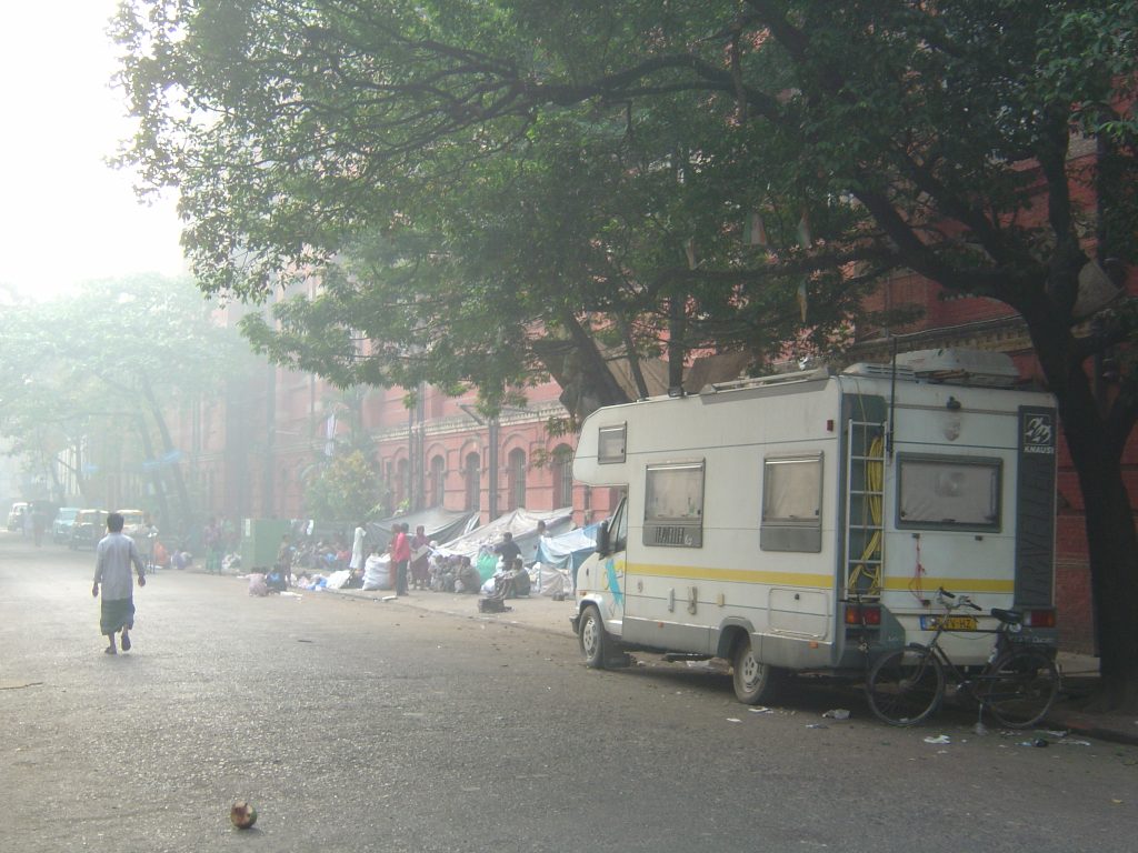 Ik was al eens in Kolkata geweest, en vond het toen, tegen alle verwachtingen in, een leuke stad, met aardige mensen, en mijn plan was om in het midden van de stad te parkeren. Ik vond een perfecte plek, in Sudder Street, het hartje van Calcutta, naast een kerk. Ok, het was niet de rustigste plek die ik ooit gehad had, maar dat had ik natuurlijk ook niet verwacht. Ook moest ik fix parkeergeld betalen, 120 roepies per dag, maar daar tegenover stond dat ik eigenlijk ook geen hotel nodig had. Op de stoep woonden mensen die daar hun business hadden zoals afval verzamelen of thee verkopen, en die sliepen dan ’s avonds op de stoep in hun eigen gemaakte tentje van plastic en stokken. Ook waren er overal water pompen waar het water gratis is en ondanks misschien niet helemaal lekker smaakte was het prima om je mee te wassen en na het door de waterfilter te halen ook om te drinken. Verder was het zoals verwacht veel bekijks, vooral Brox deed het goed, en het was erg vaak mensen weg sturen, maar deze keer had ik het verwacht en vond ik het minder erg.