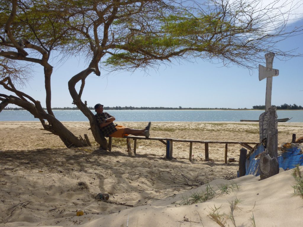 Mijn doel vandaag was de Zebrabar. Een mythe onder de overlanders. Het is een camping/campement/hotel/restaurant aan zee. Eigendom is een Zwitsers echtpaar en ik geloof dat elke overlander hier komt om één nacht te verblijven, om dan uiteindelijk na een flink aantal dagen te zeggen…ik moet nu echt verder. Zo ging het mij ook af. Niet zozeer omdat het luxe is, maar gewoon omdat het er heerlijk ongedwongen laat-maar-waaien is. Het ligt aan de zee, er is een privé achtig strandje, je kan er goed zwemmen. Er ligt een kano om mee te varen, een surfplank. Er was een restaurant (zelf pakken en dan zelf opschrijven) en het was er rustig. De natuur was schitterend, midden in een beschermd vogelgebied.