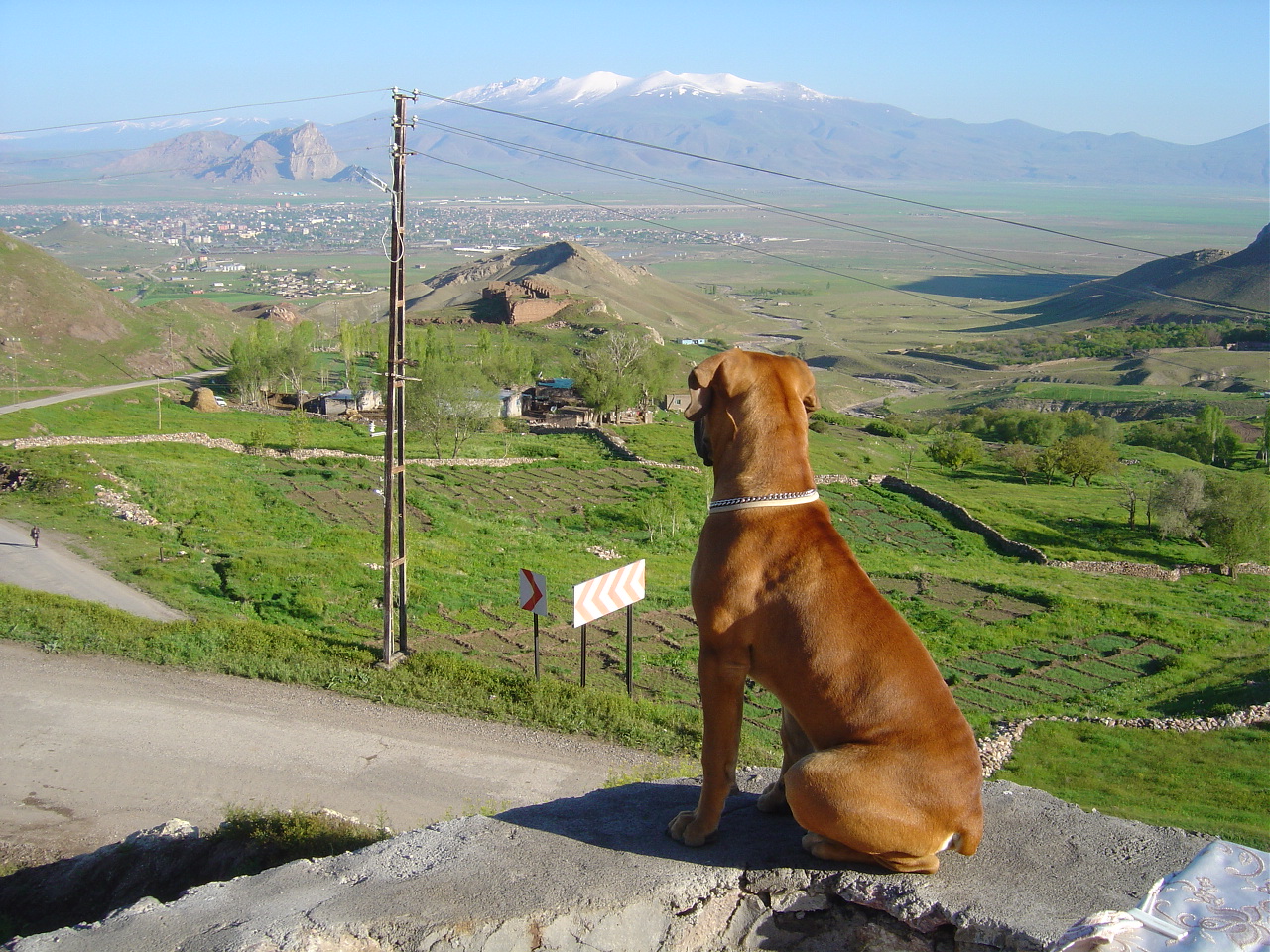 Voor dat ik de weg naar Dogubayazit in sloeg wilde ik een bezoekje brengen aan het fort van Kalesi . Er was vlak bij de stad een berg, en tja, daar moet je dan natuurlijk een fort op bouwen, dat is logisch. Onderweg er naar toe kwam ik een Migros tegen, een grote supermarkt, en daar moest ik even van genieten natuurlijk. Het fort, van het jaar 700-800 voor Jezus was een flinke ruïne, er stond nog weinig van overeind. Toch was de loop naar boven een leuke bezigheid die zeker Brox ook als zeer prettig heeft ervaren. Even lekker los rennen is prima. Wel hield ik af en toe mijn hard vast want boven op de oude muren keek je een paar honderd meter de diepte in, en Brox ging als maar pal op het randje lopen. Een verkeerde beweging en … floeps. De uitzichten op de Berg Arafat waren spectaculair.